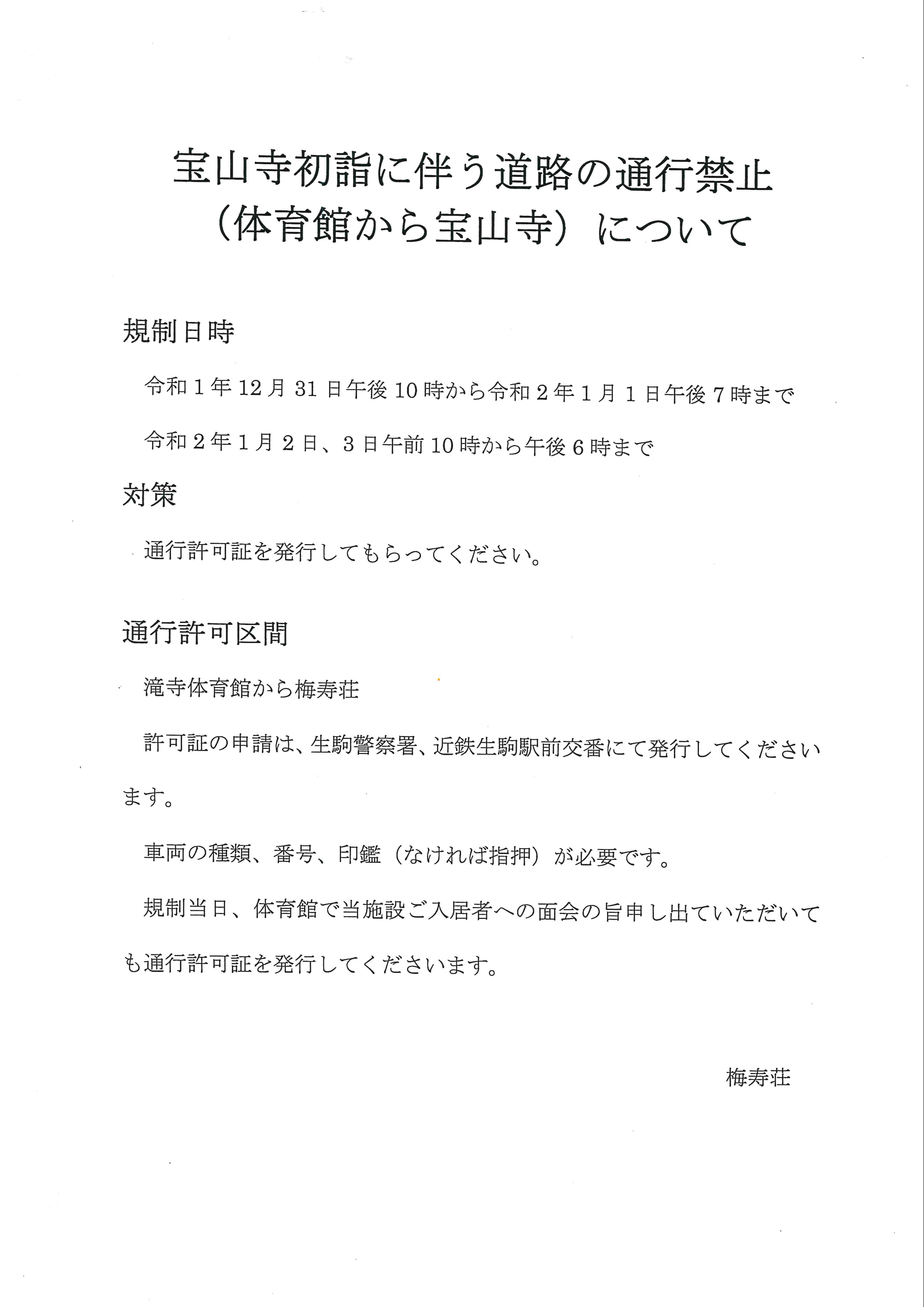 宝山寺初詣に伴う道路の通行禁止がありますのでご注意下さい。